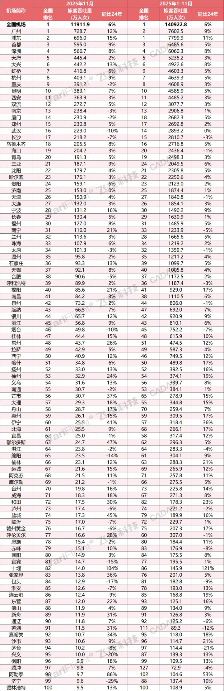 美股之家股票配资 2025年11月机场旅客吞吐量排名数据